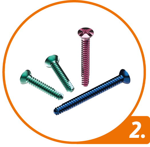 Fixationsschrauben aus Titan befestigen Knochentransplantate stabil. Das Kit enthält Schrauben mit einem aggressiven und einem passiven Gewinde für die unterschiedlichen Knochenqualitäten.